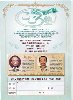 昨日、山折哲雄先生の「読売こころ塾」が大阪市中央区にある大槻能楽堂でありました。ゲストは「千の風になって」の作曲者であり、詩の翻訳者でもある新井満氏。この塾は出席するたびに何か気持ちが豊かになるというか、心が慰められるというか、何かしら心にいい影響を与えてくれます。