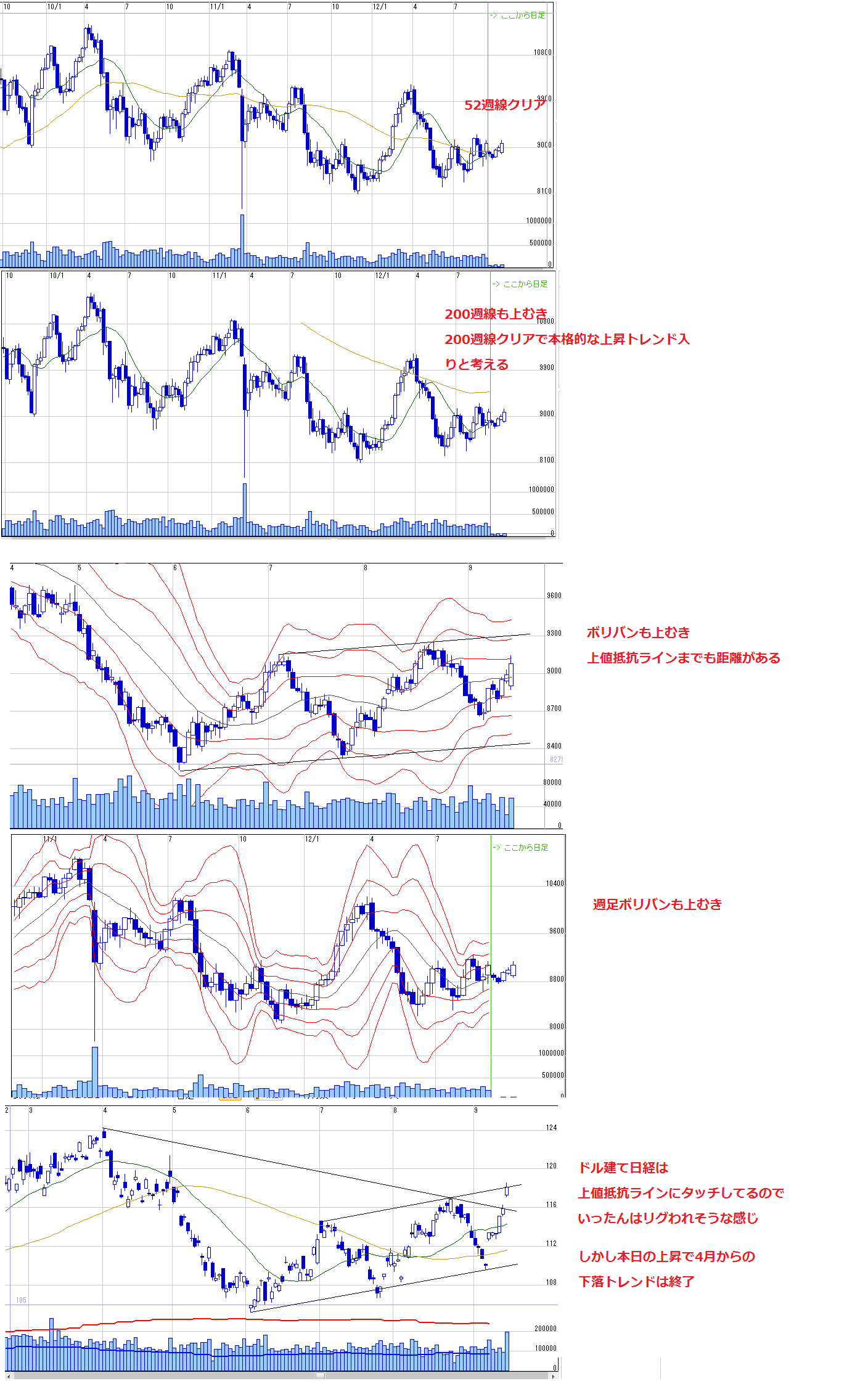 見通しは週初と変わらず。上値めどの9100に達しましたが、まだ上がありそうですね、、、