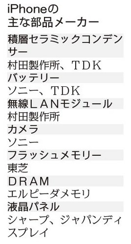 米調査会社IHSアイサプライの推計では、アイフォーン5の液晶パネルはシャープ、韓国LG電子に加え、ソニー、東芝、日立製作所のパネル統合会社「ジャパンディスプレイ」の3社が供給。最大手の韓国サムスン電子が、アップルとの特許訴訟の影響で「締め出された」(部品大手)。前機種の4Sは1億台以上を販売。部品原価は188ドルとされ、単純計算で1兆円以上の部品市場を創出した。メーカー幹部は「ここまで収益力の高い商品は初めて」と語る。