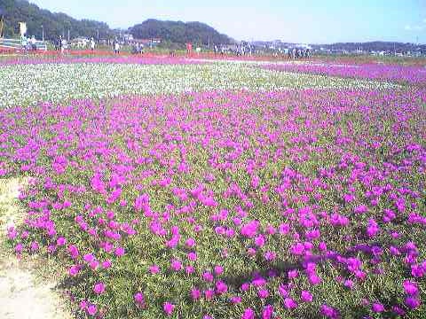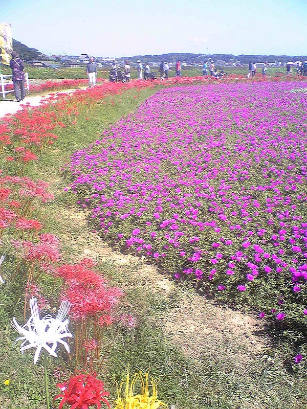 向こう側に彼岸花があるが、松葉牡丹の畑もあります。半田市の5年ぶりのお祭りの前に。