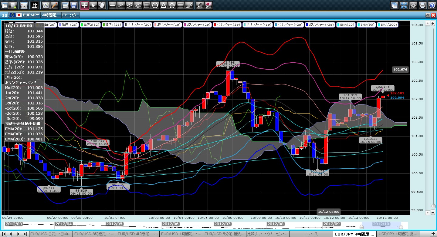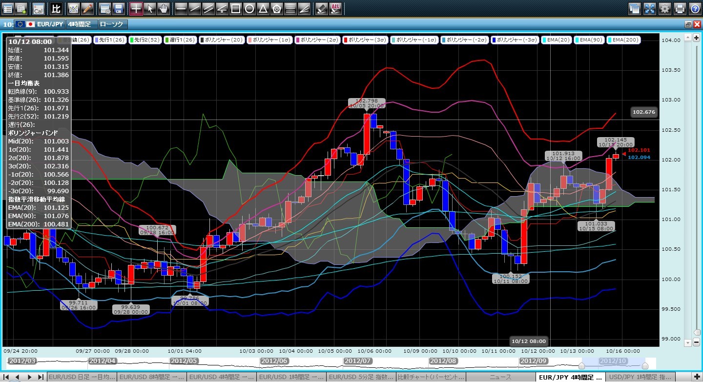 早めに10ポイントで決済してしまったが、4時間足基準線101.033ピッタリまで下落。