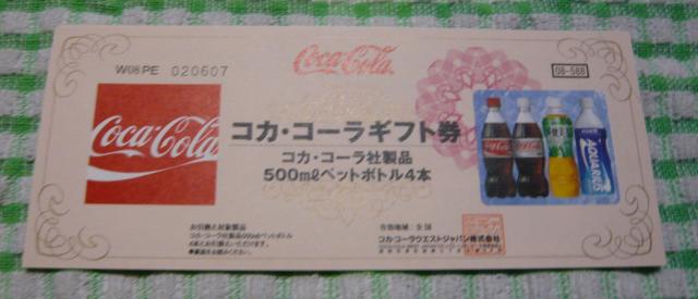 のコカコーラ社ギフト券(1枚で500ml製品4本と引換え) がもらえます。このギフトカードはスーパー等では1枚588円の商品券としてコカコーラ社以外の商品の買い物にも使用できます。