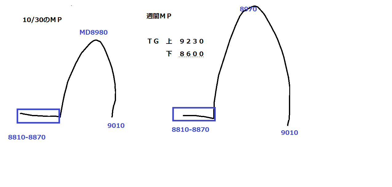 最初の窓をうめてしまったので、下値は8710-8770の窓まで広がったと思います。