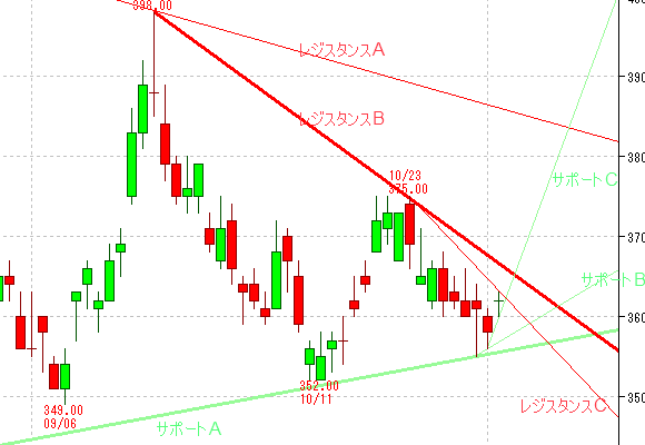 サポートB(10月11日安値352円から10月26日安値360円の延長線)