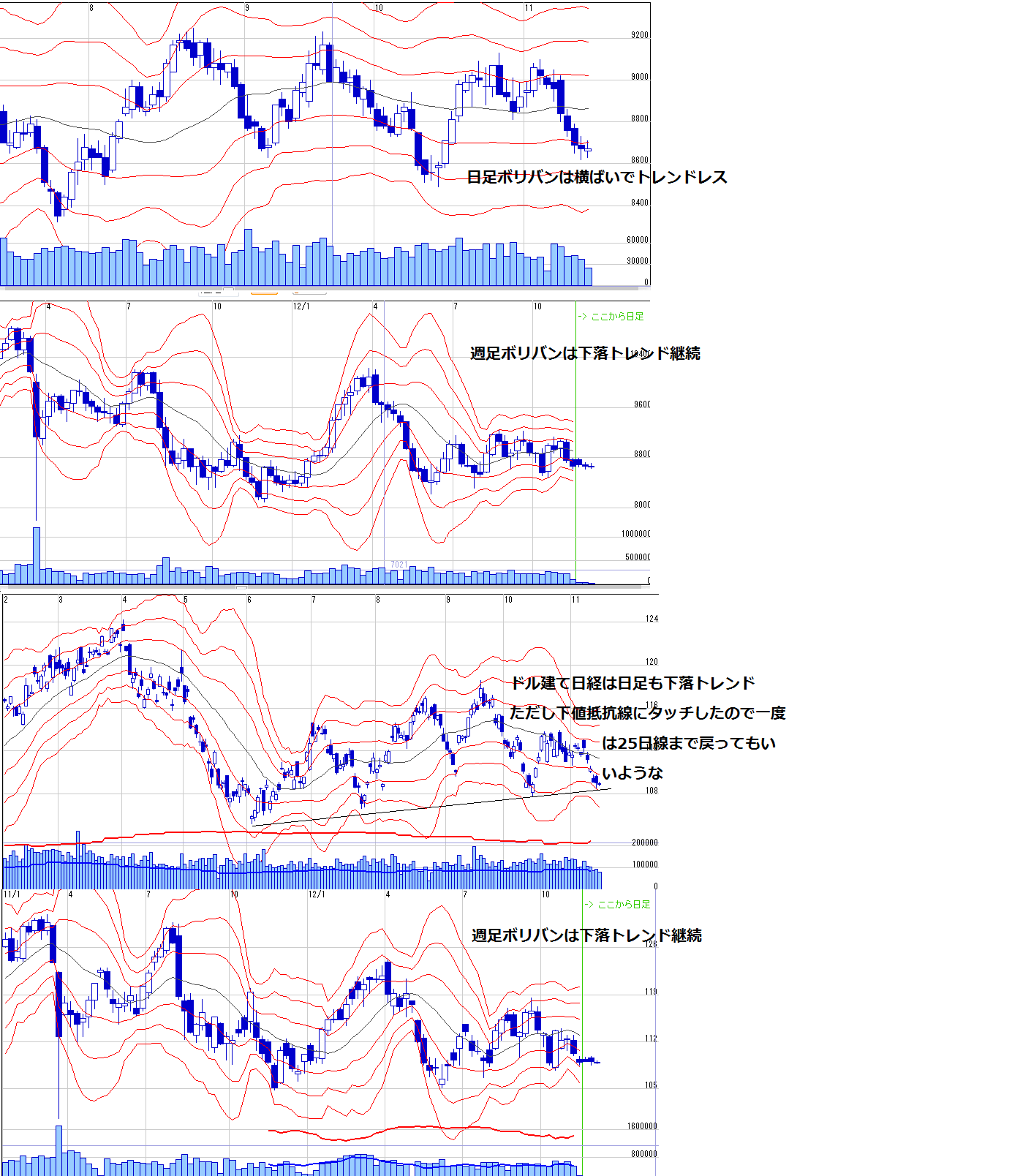 ボリバンは日足は下落トレンドは終了して横ばい、