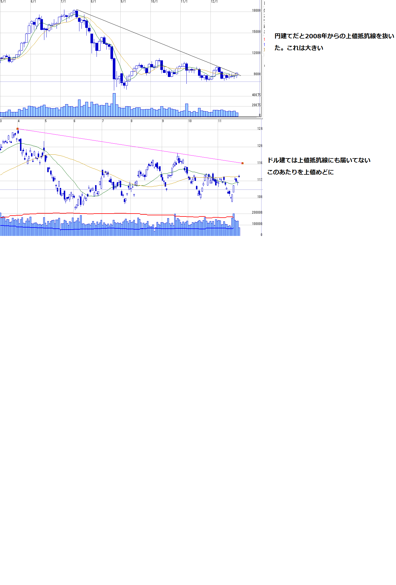 円建てだと2008年からの下落トレンド脱出で大相場の始まりにもみえますが、