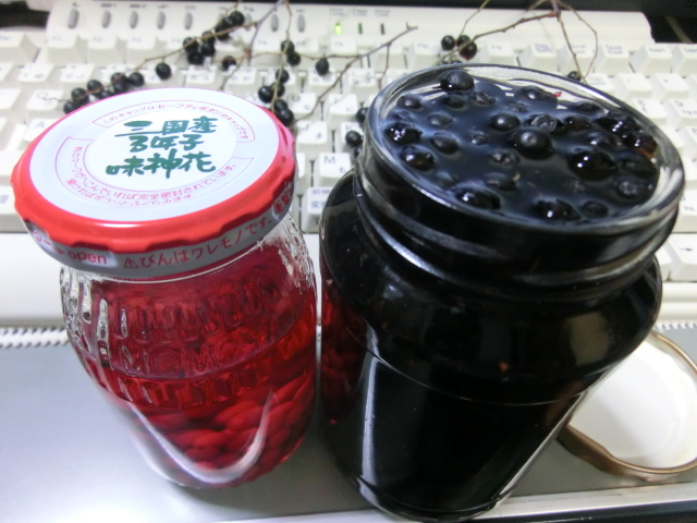 写真の赤いのは ガマズミ酒 で、黒いのが ナツハゼ酒 です^^