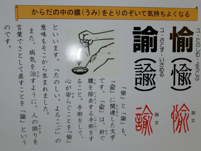 愉 諭などの漢字の意味、成り立ちがパネル展示してあります^^