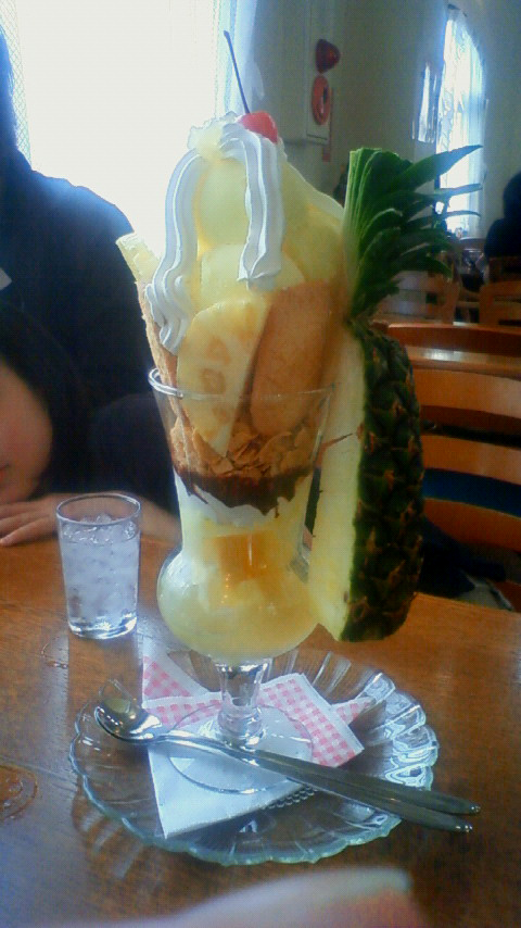 パフェはうまそうで、実際うまいんですけど、上のほうの4分の1を食べたらもう結構きつくなってきます。ディッシャーで7コ分のパインシャーベットをまずやっつけなくてはなりません。 その後約半個分の生パイナップル、茶碗2杯分のコーンフレーク、下のほうにはパイナップルジュースにご丁寧にパインゼリーまで入ってます。しかも生クリーム付(>