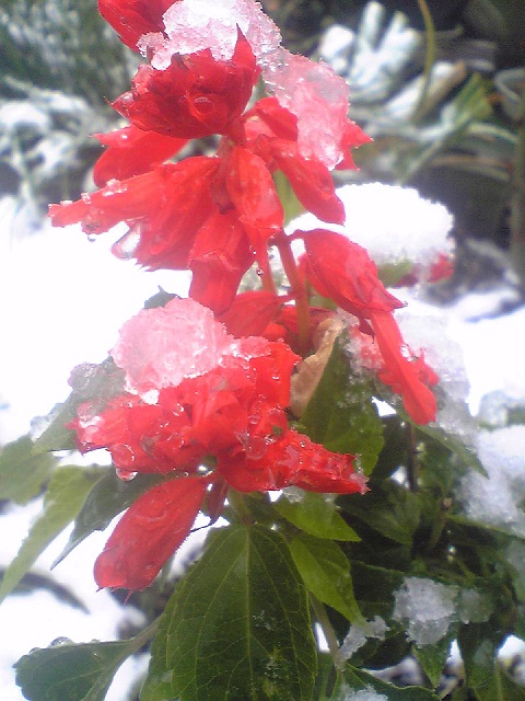 先日の雪で雪が積もったが夏の花がまだ咲いている