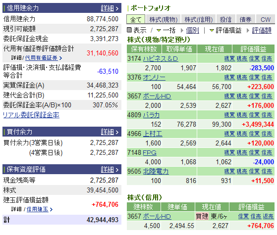 3657 ポールHD が 100円強あがって,70万ほど増えたのが主要因。