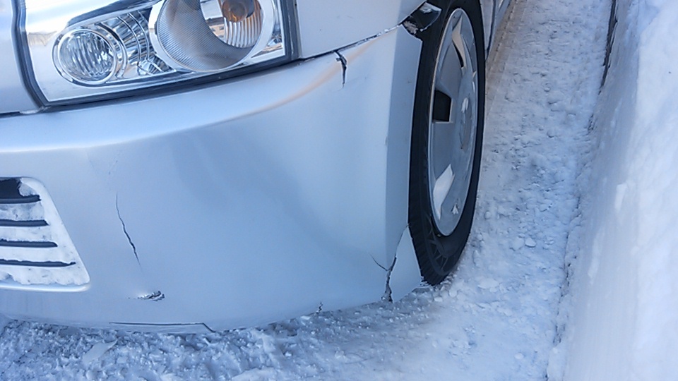 車が白いので雪の色の中ではパッと見わかりにくいので、春になってから直された方がよろしいのでは、またやらないとは限りませんですし・・・。