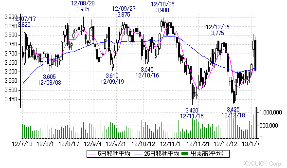 あとチャートでは、5日移動平均線が25日移動平均線を抜けてます。日経平均株価も好調なので、3900円はいくだろうと、よって3880円で指値を入れておこうと思います。