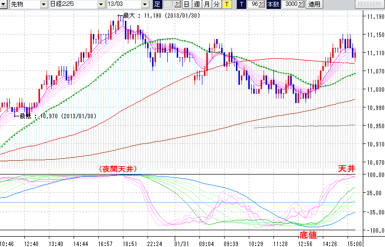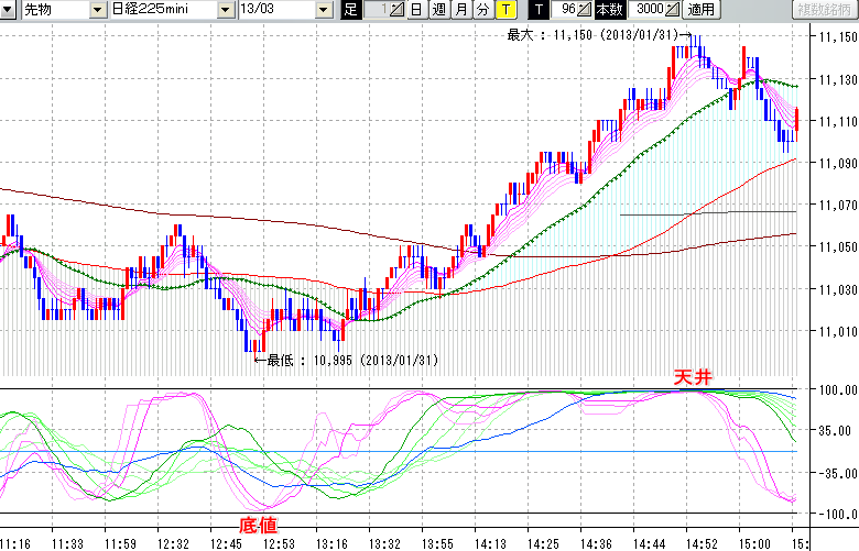 日経225mini先物チャート(下) : 96ティック足