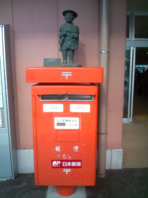 富山駅にある郵便ポストに「富山の薬売り」がのっかっていました。