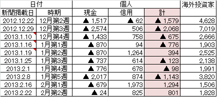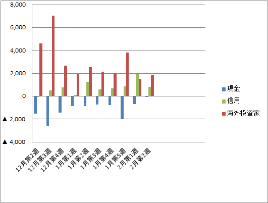 楽観的にみれば、2月になって海外投資家の買いがガクッと減ったけど、第2週でまた増えているので、目先の調整はあってもトレンド転換はまだしばらく先なのか。