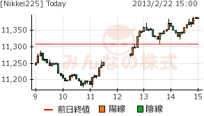 憶測通り11200円まで下げたが、NKの25日移動線で反発したかのような反騰を開始。円高振れもココまでと見られたようで、両方とも円安株高めがけて続騰となった。昨日からの売りが一巡ということにもなるのか・・・。(ちなみに、同じような反騰は1/23にも)