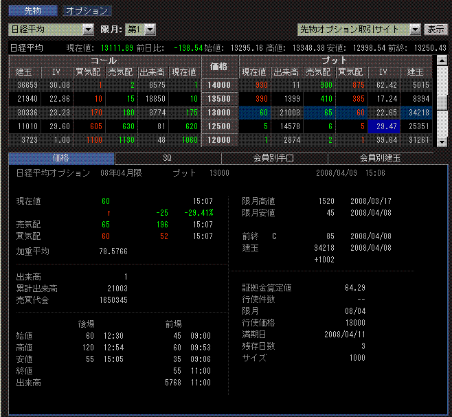 大林組の下方修正がきっかけになった感じですが、オプションのP130(行使価格13000円のプット)の建て玉が大きくなっていたので、おそらくP130売りに対しての先物ヘッジ売りが入ることを狙った売り仕掛けが先物に入ったのだと思います。って、わかりにくい日本語ですね・・・。えーと、P130を売っているとSQ値が13000円を割り込んだ場合、13000円-SQ値の分を払わないといけないので、13000円に近づくと先物を売ってヘッジするところが出てきます。先物を売っておけば、13000円を下回っても先物売りの利益で相殺されます。というわけで、建て玉が多いとそれだけヘッジの先物売りが出て下げやすくなるので、それを狙えば売り方は利益を上げやすくなります。