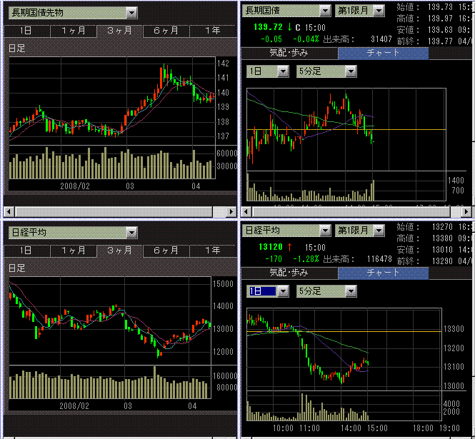 前日引け後に発表されたアルコアの決算とAMDの売上見通しが冴えなかったことから寄り付きから売られました。IMFが発表した金融機関の損失見通しも嫌気されたのかもしれません。午後2時に発表されたFOMC議事録は結構弱気な内容でしたが、株式市場はあまり反応せず。むしろ発表時点からはやや上げて引けました。為替はボラが収まってきたのと円売りが強い感じです。CFTCのデータだと投機筋の円買いがたまってたので、マーケットの混乱が収まってきたのをきっかけとして手仕舞いしているのかもしれません。