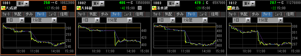 昨日大きく下げた反動と円安進行からCMEの日経平均先物が高く帰ってきて、日経平均は朝方は反発して始まりましたが、ショートの買戻しも一巡したのか上値の買いが続かず、昼休みに大林組が下方修正を発表するとゼネコン株に売りが殺到し、それをきっかけにして先物にも大きな売りが続き日経平均は一時13000円を割り込むところまで下げました。引けにかけては買い戻しが入りある程度戻して引けました。