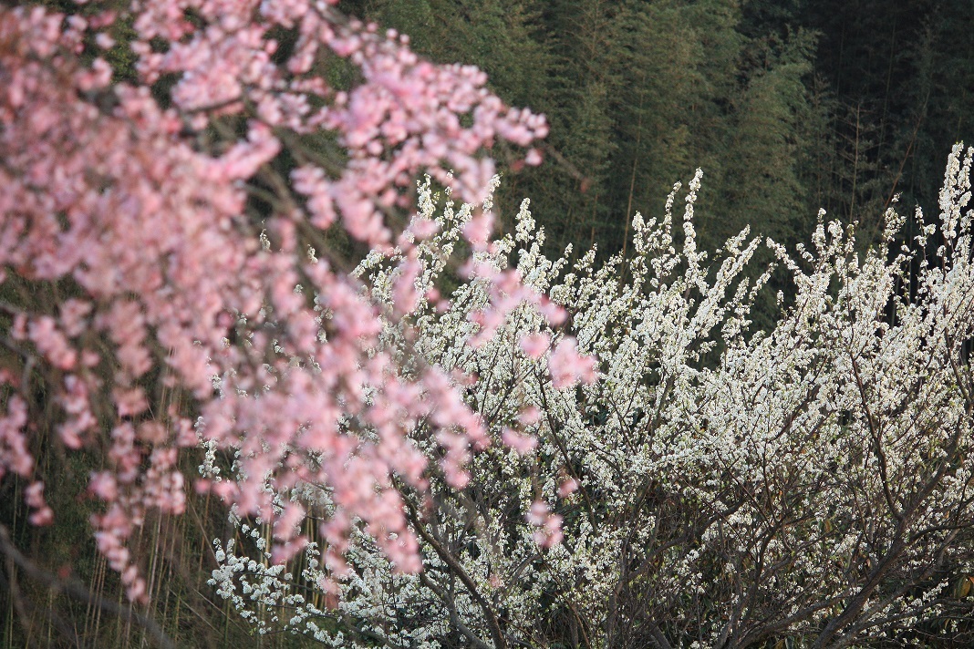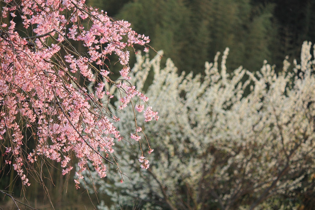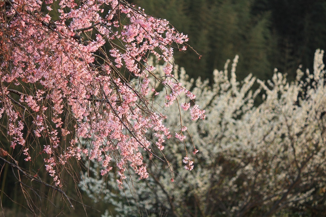 紅しだれ桜とスモモの紅白競演 里は花盛り