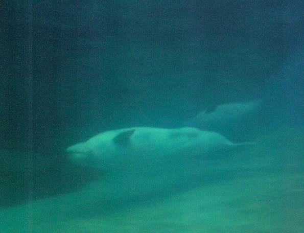 ベルーガの子供も親のまねして空気のわっかが出せるようになったとか?お母さんにくっついてまだ、お乳をもらっているそうです。名古屋港水族館