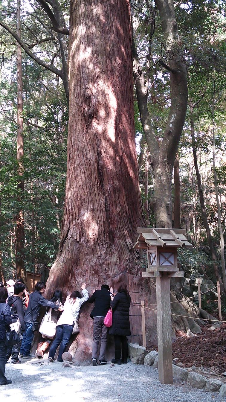 参道の帰り道を歩いていると大木を抱えるように寄りかかっている人がたくさんいました。