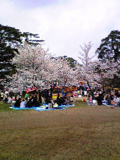 午前11時頃に公園に着くとすでに花見客がたくさんいましたが、天気が今ひとつだったせいか思ったほど混んでいなくていい場所を確保できました。でも、ちょっと山の上の公園なので吹く風は冷たく、ジッとしているとかなり寒い感じでした。