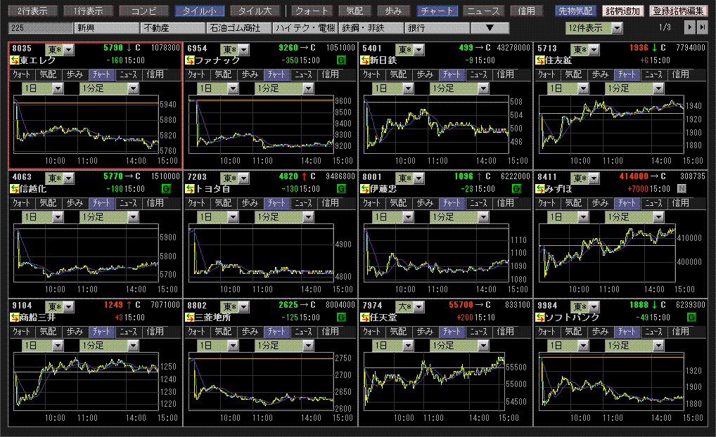 米株の大幅下落と円高進行から、日経平均も大幅反落。みずほや任天堂が前日比プラスで引けたのに対して、値嵩株が大きく下げたことから、日経平均の方がTOPIXよりも下落率が大きかったです。東証一部出来高は15億株、売買代金は1.8兆円と、大幅下落したのにかなり商いが少なかったです。