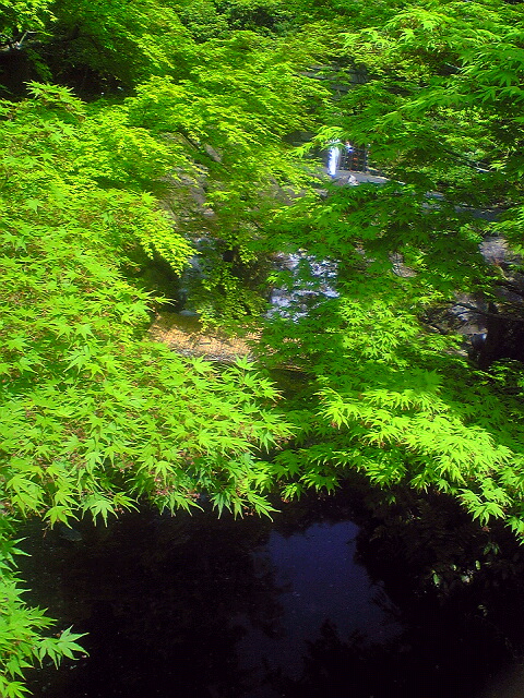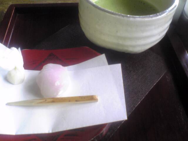 水に映える新緑に包まれて、美味しい生菓子を抹茶で頂く。