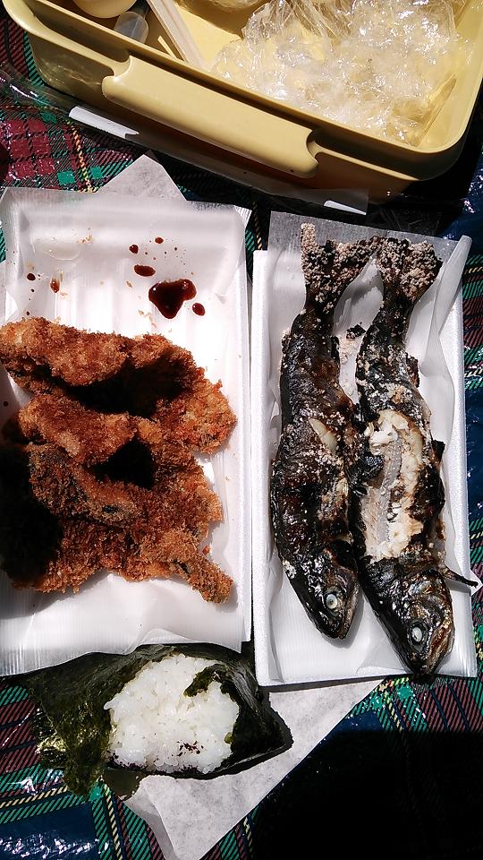 でも、なんとか4匹釣れたところで、2匹ずつフライと塩焼きにしてもらいました(写真中)。