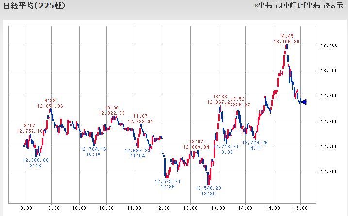 日経平均の終値が前日比で-0.21%の12,877.53(前日比-26.49)で朝の寄り付きでシカゴ日経平均先物の米国市場終値12,700円にさや寄せして始まったことを考えるとそこから200円近いプラスとなり、日経平均で見れば株価防衛は成功したといえそうである。