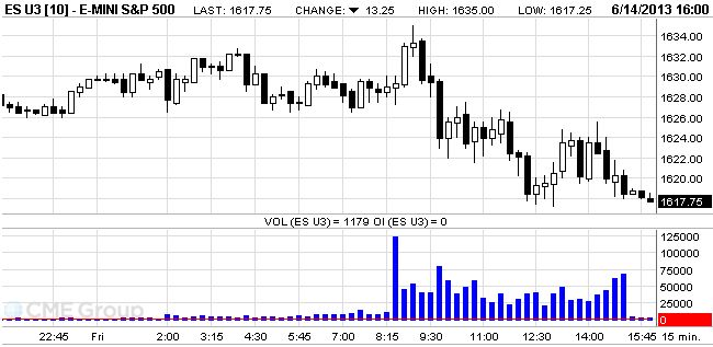 S&P500のシカゴ先物価格は出来高が増え始めた現地時間で8:30頃に1,629ドル位、9:00頃は1,633ドル位でスタートし、終値は1,617.75ドルとなり、前日比で-13.25ドルの下落。