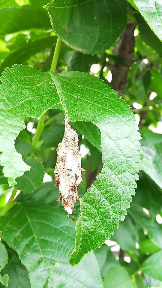 そんなミノムシがうちの庭の木の葉っぱにぶら下がっていました。