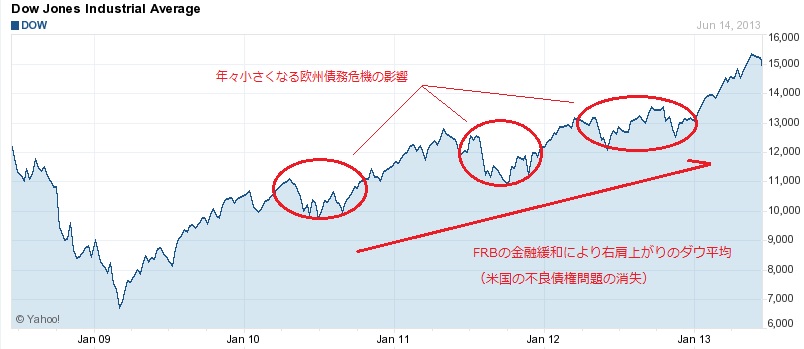 米国にはリーマンショックの米国独自の不良債権もあったし、欧州の不良債権にもかんでいるのに、金融緩和を十分やったため、米国独自の不良債権は消失していき、欧州債務危機の悪影響も小さくなっていき、そして、景気回復と株価上昇が続いた。