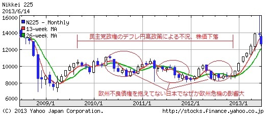 一方、日経平均は欧州危機以前に、民主党政権成立、民主党政権の円高デフレ政策スタートと同時に日経平均の右肩下がりが続いた。 そして、日本独自の不良債権もなく、欧州不良債権にもかんでいないのに、欧州債務危機の悪影響が毎年甚大であった。