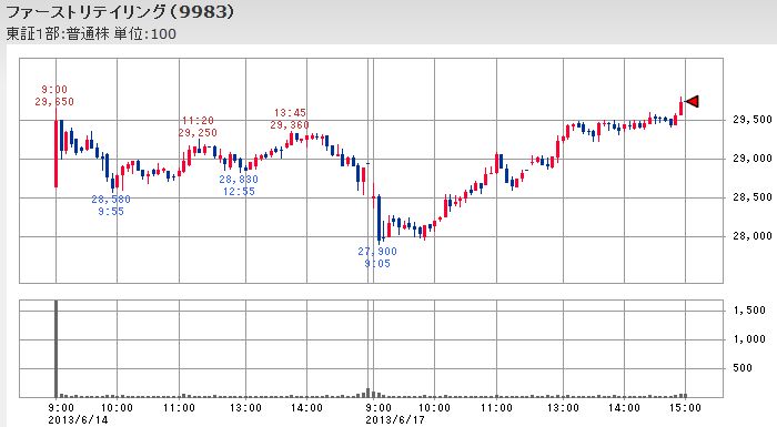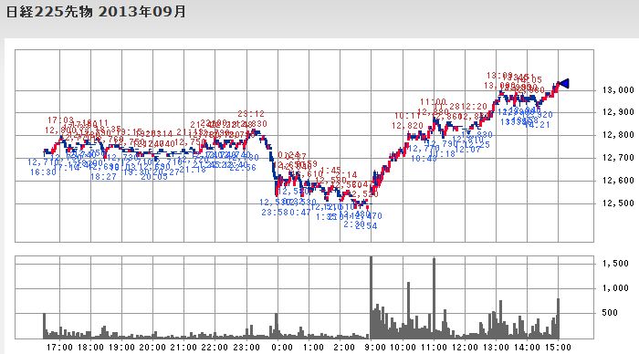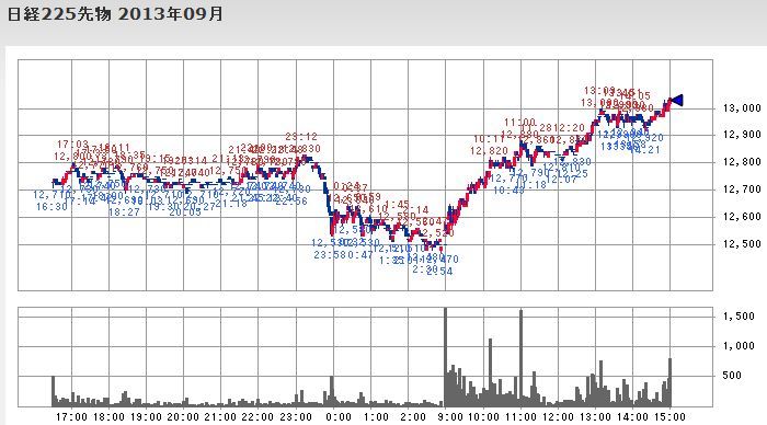 そして、売り方優位の日に良く見られる14時代後半での仕掛け的な売りによる株価の急落も本日は見られず、その時間帯に行われた13,000円台の攻防も買い方の仕掛けが有効に働き、あっさりと前日終値比300円を超える上昇と13,000円を突破する終値となっています。
