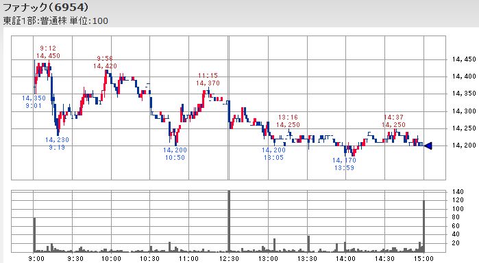 こうした買い支えの効果が出たのか12:45頃に13,145円位まで値戻しすることに成功しましたが、13:00頃に出来高が増えて下落が始まり、14:00頃にも出来高が増えて下落が加速していって14:12頃に本日の最安値12,966.41円へ下落して13,000円割れへ再び追い込まれる形になりました。