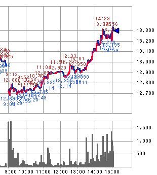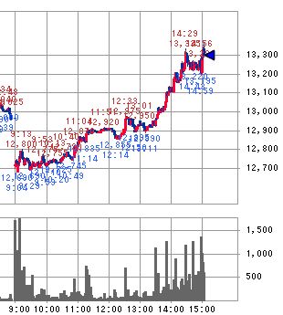 このような値戻しの広がりが進んだところに、13:30ころから4・5回ほど先物へ比較的大きな規模の仕掛け的な買いが入って14:29に13,330.35円へ急上昇させることに成功し、一気に前日比約300円の大幅上昇へ一気に形成を逆転したのです。