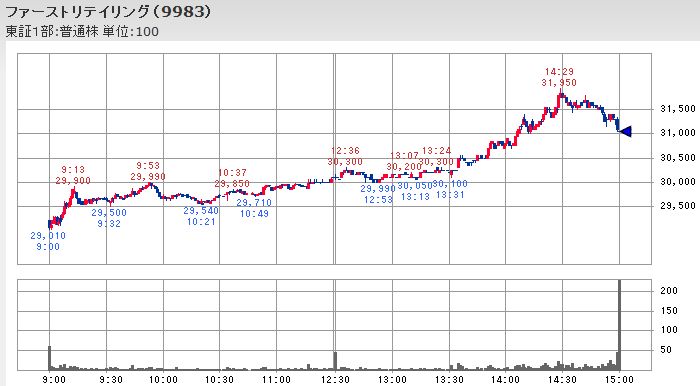 ただし、13:31の30,100円から14:29に31,950円まで約6%上昇したファーストリテイリングに代表されるようにこの値戻しはとにかく日経平均を上昇させようという買い方の強い意志によって多少の無理を覚悟で進められた面があるといえそうです。
