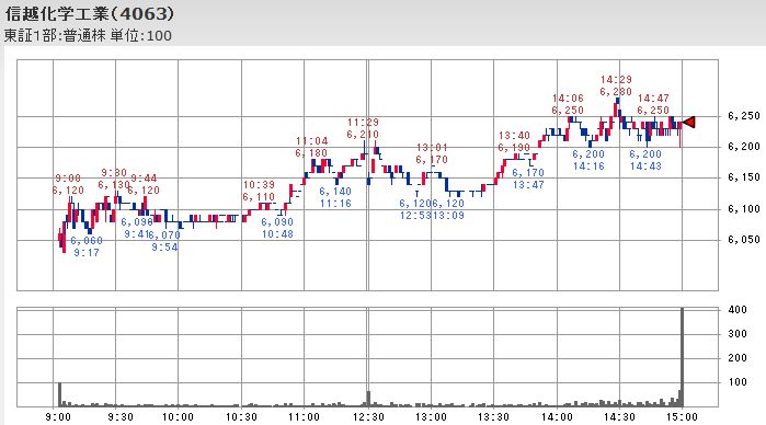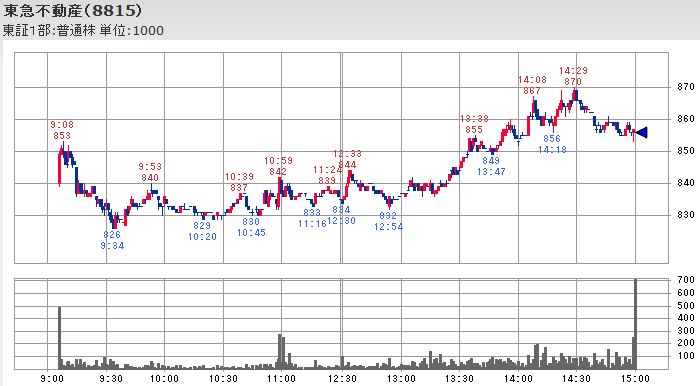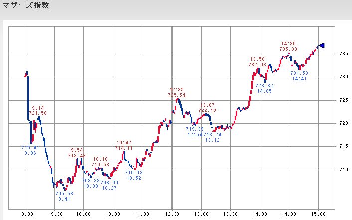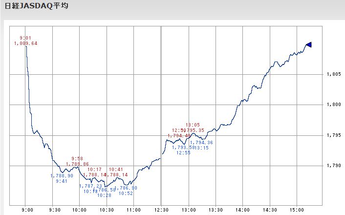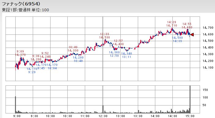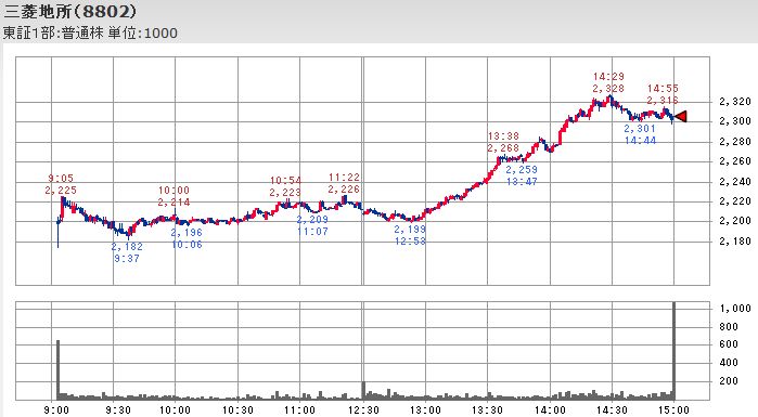 こうした日経平均が停滞していた時間中の値動きを見るとファナックが12;33に付けたその時点までの本日の最高値から200円近く下落し、自動車株を中心とする輸出銘柄も同様に値を崩して平均株価の足を引っ張っていたのですが、不動産大手の株価は12:53頃に後場の最安値を付けた後再び上昇して平均株価を下支えする形となっており、主役を交代しながら平均株価が維持されることで値戻しが幅広い銘柄に広がる傾向になっていたようです。