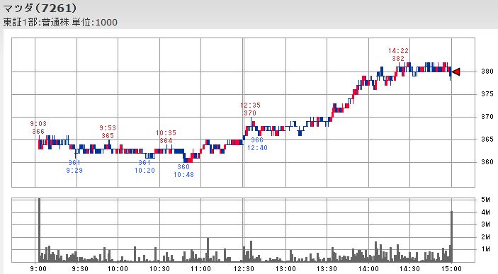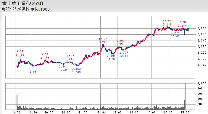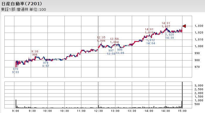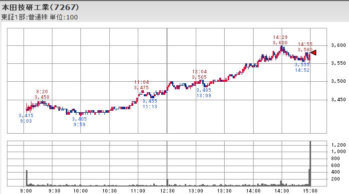 この仕掛け的な買いの際には先物買いの裁定取引で先物と連動して上昇する傾向にあるとされるファーストリテイリングやファナックではなく、同時並行して円高ドル安から円安ドル高へ戻し始めた為替との合わさって、日経平均寄与度が高く為替の影響を受け易いホンダを上昇させると共に、トヨタ、マツダ、日産自動車、富士重工といった自動車株が一斉に上昇に転じる形になっています。