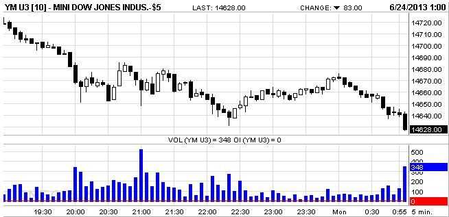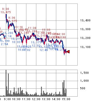 そして、日本時間10:00(シカゴ時間20:00)前後にシカゴダウ平均先物が14,650ドルへ急落したことを受けて、日経平均先物も13,130円へ急落してしまい、それに合せる形で日経平均も下落しています。