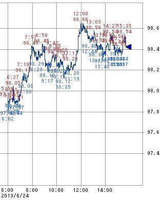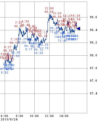 為替相場の方は12:00に98.66円に達するなど円安ドル高が続いていますが、トヨタやホンダなどの主力輸出株が前日比マイナスとなるなど、円安効果による下支えもあまり機能していません。