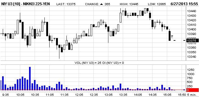 昨晩のシカゴ日経平均先物はシカゴ時間16:00(日本時間6:00)で13,395円(前日13,180円、東証終値比+180円)でその頃のドル円が98.4円(前日97.7円)くらいでしたから為替はシカゴ日経平均終値の頃より0.7円の円安ドル高で、東証終値13,213.55円のとき98.0円より0.4円の円安ドル高となっており、も日経平均先物も東証終値から連日約200円近い大幅続伸しています。