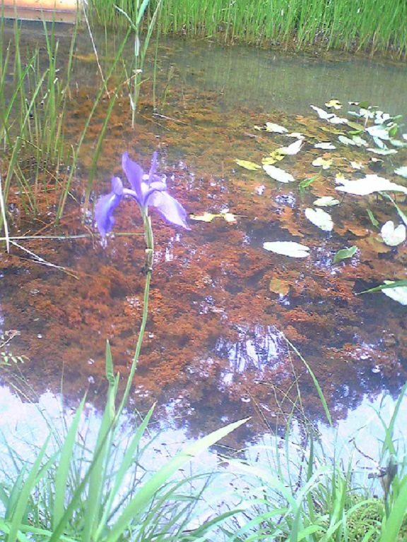 左の上にスジグロギンヤンマか?下の水辺にはイトトンボ、花は野花菖蒲でしょうか?