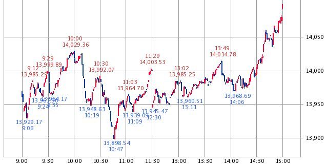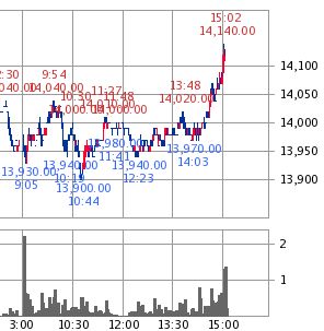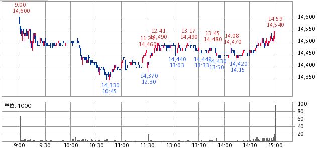しかし、後場に入ってからは逆に13:30前後に99.55円から99.7円前後と14時台に99.65円から99.8円前後となった円安ドル高や、香港市場が13:14(日本時間14:14)前後から13:42(日本時間14:42)に、上海市場が13:12(日本時間14:12)前後から13:36(日本時間14:36)に、シカゴダウ平均先物が0:15(日本時間14:15)前後から1:00(日本時間15:00)に堅調に推移し始めたことを材料に売り仕掛けが入って上昇し、後場だけで13,945.47円から14,098.74円と約150円近く上昇して終えています。