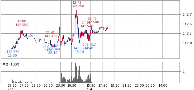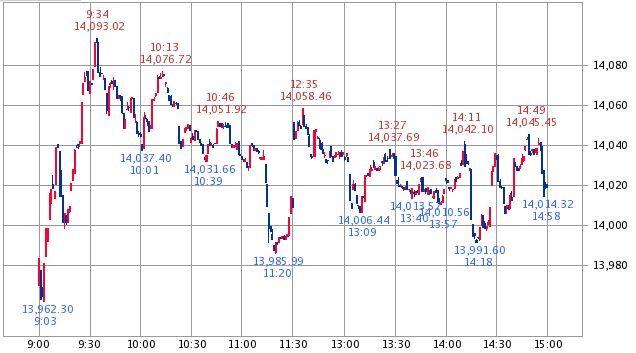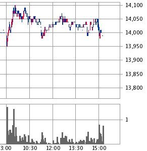 後場はそこからギャップアップして14,050円前後で始まり、12:35に後場の最高値となった14,058.46円を付けた後は13:09に14,006.44円まで下落しましたが、14:11に14,042.10円を付けるなど14時過ぎまで安定して14,000円の大台は保つ形になりました。