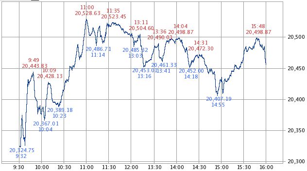 その後は上下に変化しながらも香港や上海などの市場が上昇して安定していたことを背景に11;10頃までに14,030円以上の水準を保ち、そのまま前場を終えるかと思われましたが、特に香港や上海などの市場が急落に転じたわけでもなく、手掛かり材料らしきものはなかったのですが先物に売り仕掛けが入って11:20頃に13,985.99円まで約60円急落したのが本日では最大の急落となっています。
