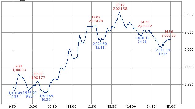 一方、上海も朝方こそ前日比マイナスとなったものの、10:20につけた1,974.89を底として上昇し、2,006.09と前日比+11.82(+0.59%)と反発して前日の下落分のほとんどを取り返すなど安定した相場展開となりました。